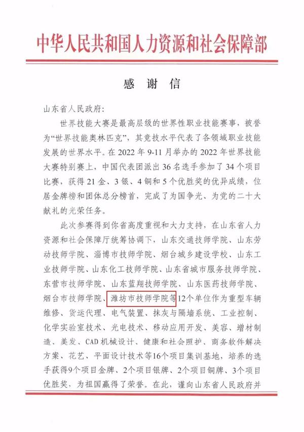 喜報丨人力資源和社會保障部對濰坊市技師學院點名表揚!