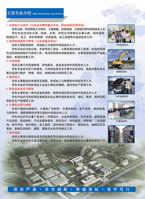 山東公路技師學(xué)院簡(jiǎn)介 山東公路技師學(xué)院直屬于山東省交通運(yùn)輸廳,是一所以培養(yǎng)交通行業(yè)高技能人才為主,集職工培訓(xùn)、成人教育、技能鑒定、駕駛培訓(xùn)和智慧交通技術(shù)應(yīng)用與試驗(yàn)于一體的綜合性公辦全日制技師學(xué)院。 學(xué)院目前兩地三區(qū)辦學(xué),主校區(qū)、無(wú)影山校區(qū)和德州校區(qū),其中主校區(qū)坐落在濟(jì)南市經(jīng)十東路,交通便利,設(shè)施設(shè)備先進(jìn)齊全,環(huán)境優(yōu)美??傉嫉孛娣e700余畝,建筑面積16萬(wàn)平方米,現(xiàn)有教職工300余人,在校生達(dá)12000余人。學(xué)院設(shè)有公路工程系、運(yùn)輸工程系、汽車(chē)工程系、智能控制系、信息與管理工程系、基礎(chǔ)部、智慧交通技術(shù)應(yīng)用與試驗(yàn)中心五系一部一中心,常設(shè)專(zhuān)業(yè)37個(gè)。 學(xué)院19..
