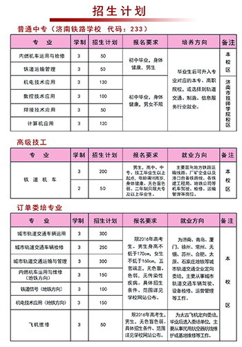 濟(jì)南鐵路高級(jí)技工學(xué)校為國(guó)家級(jí)重點(diǎn)職業(yè)院校,始建于1951年,1999年被批準(zhǔn)為高級(jí)技工學(xué)校,2005年由濟(jì)南鐵路局移交至地方政府管理,現(xiàn)為“鐵道部鐵路機(jī)車司機(jī)培訓(xùn)基地”、“濟(jì)南市軌道交通培訓(xùn)基地”、“山東省技工教育先進(jìn)單位”、“山東省花園式單位”、全國(guó)“就業(yè)之星培養(yǎng)單位”。 學(xué)校堅(jiān)持學(xué)歷教育和職業(yè)教育并舉,融大、中專學(xué)歷教育和中、高級(jí)職業(yè)教育為一體,設(shè)有軌道交通、機(jī)械工程、電氣工程三大專業(yè)群,建有城軌實(shí)訓(xùn)中心、功能齊全的鐵道機(jī)車車輛實(shí)訓(xùn)場(chǎng)和數(shù)控加工中心,擁有一支扎實(shí)專業(yè)功底和豐富教學(xué)經(jīng)驗(yàn)的雙師型教師隊(duì)伍。學(xué)校秉承鐵路優(yōu)良傳統(tǒng)和作風(fēng),鑄鐵魂、建鐵軍..