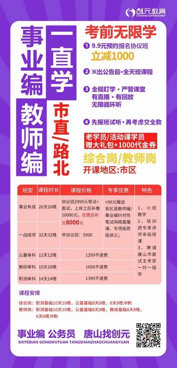 看了上述內容,各位是否也對唐山創(chuàng)元教育教資面試班產(chǎn)生興趣了呢?除此之外,唐山創(chuàng)元教育還開設有省考、國考、事業(yè)編等諸多課程班。各位對公務員考試感興趣的同學可以掃描下方二維碼進行咨詢。